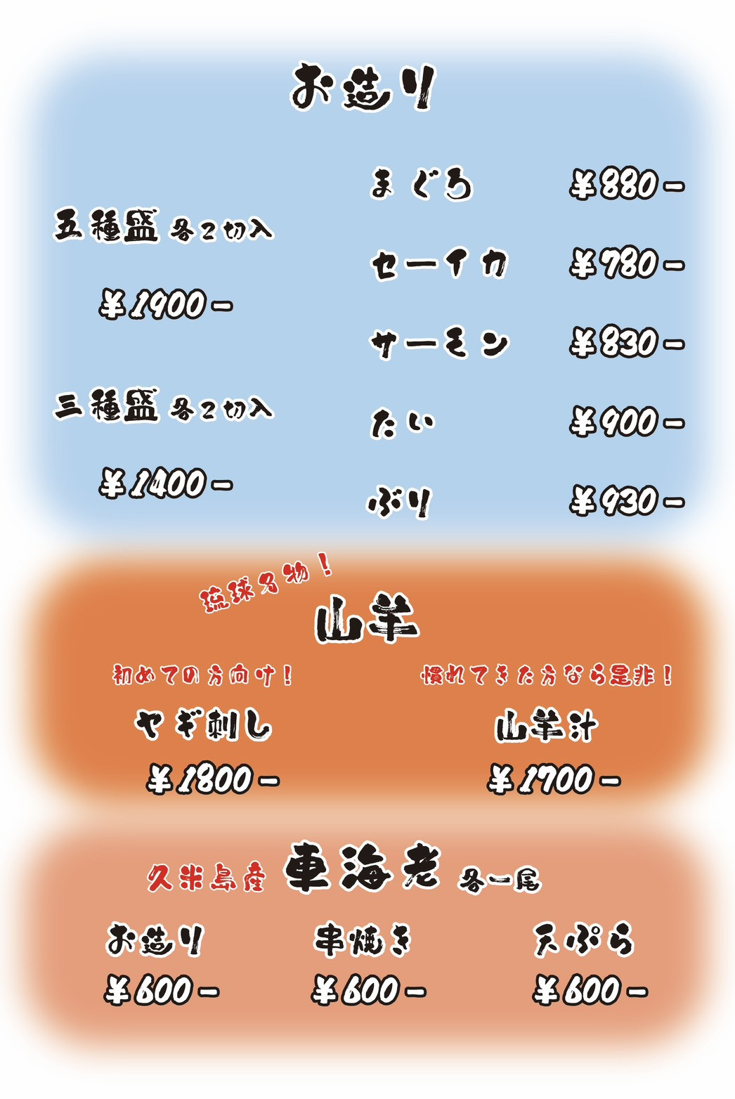 ソフトドリンク・・・コーラ / オレンジ / ジンジャーエール / グァバ / マンゴー / シークァーサー / ウーロン茶 / さんぴん茶 / ウコン茶